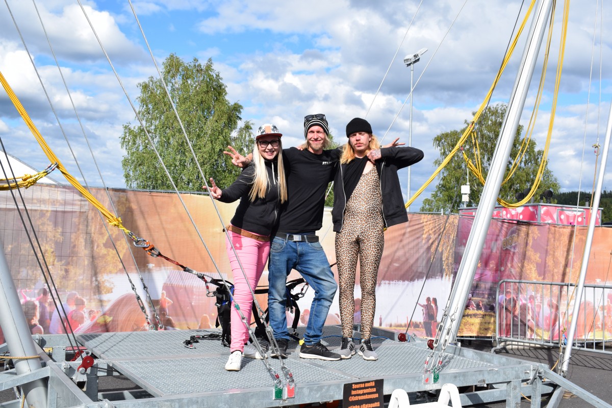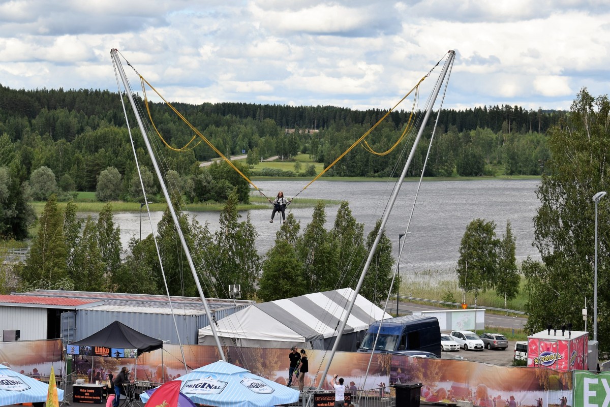 Vauhdikkaampia kokemuksia janoavat pääsivät testaamaan käänteistä Benzi-hyppyä eli ihmislinkoa. Extremekaupan ystävällinen henkilökunta tuntee kuitenkin vastuunsa festareilla. – Huonossa kunnossa ei linkoon pääse. Kuollutta lihaa emme linkoa.